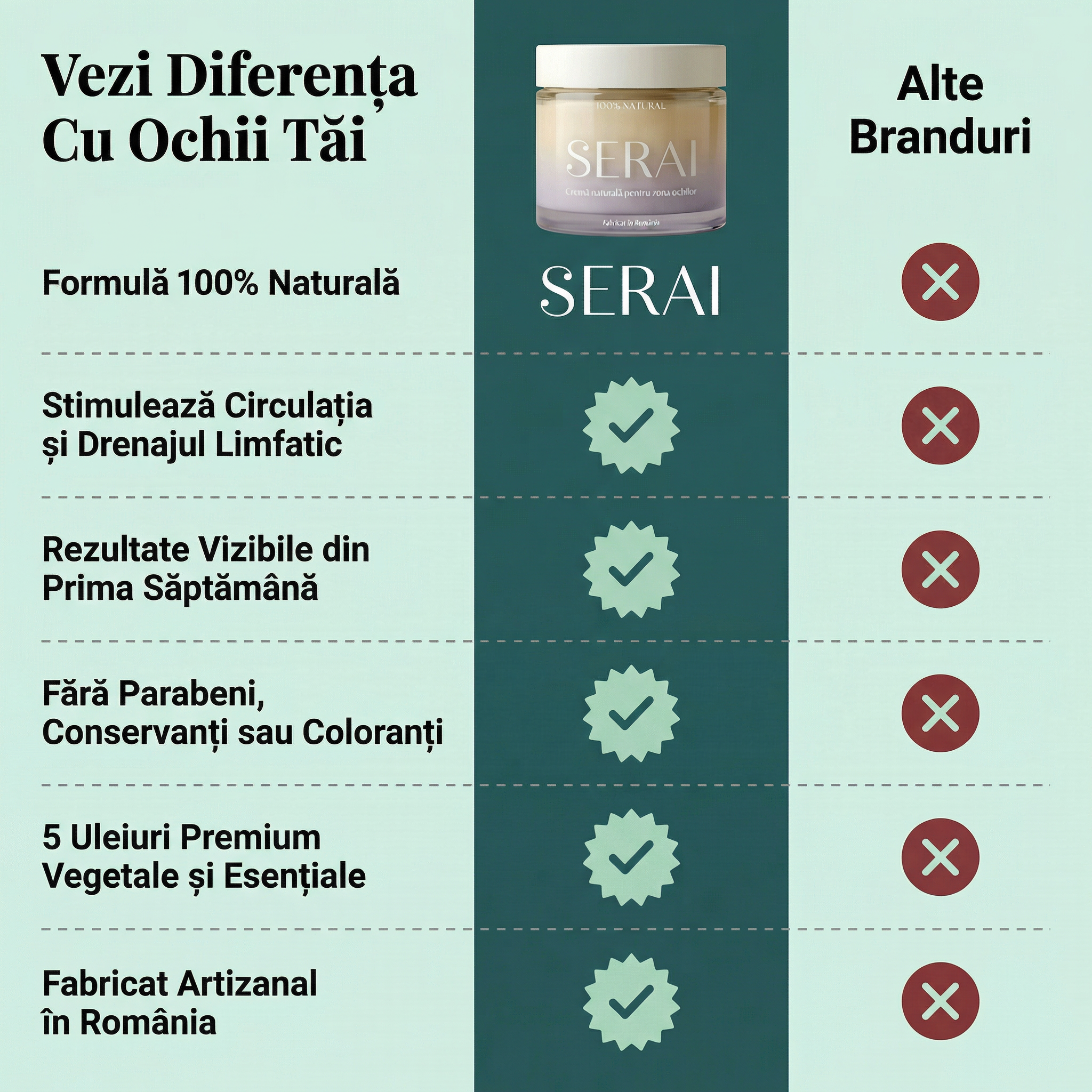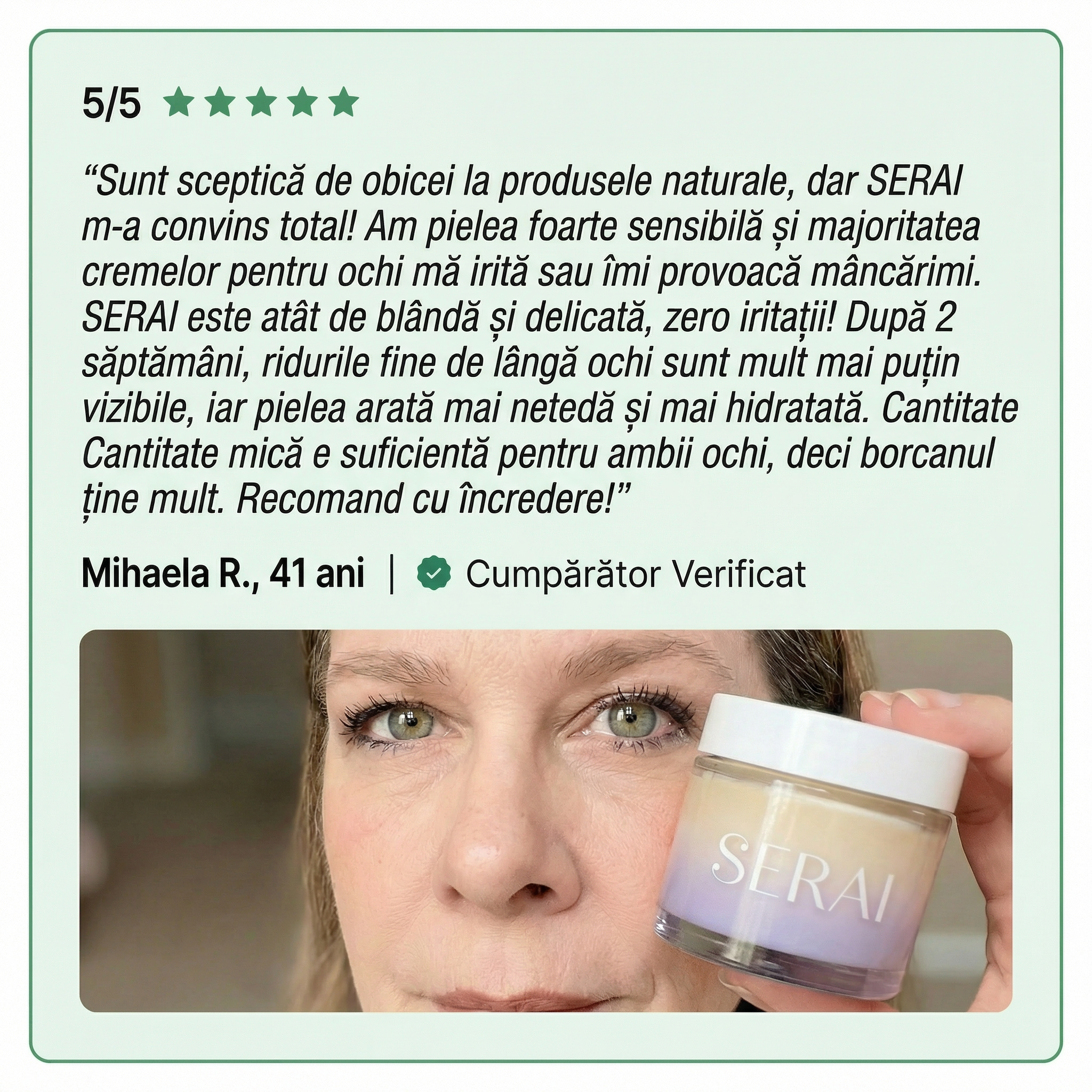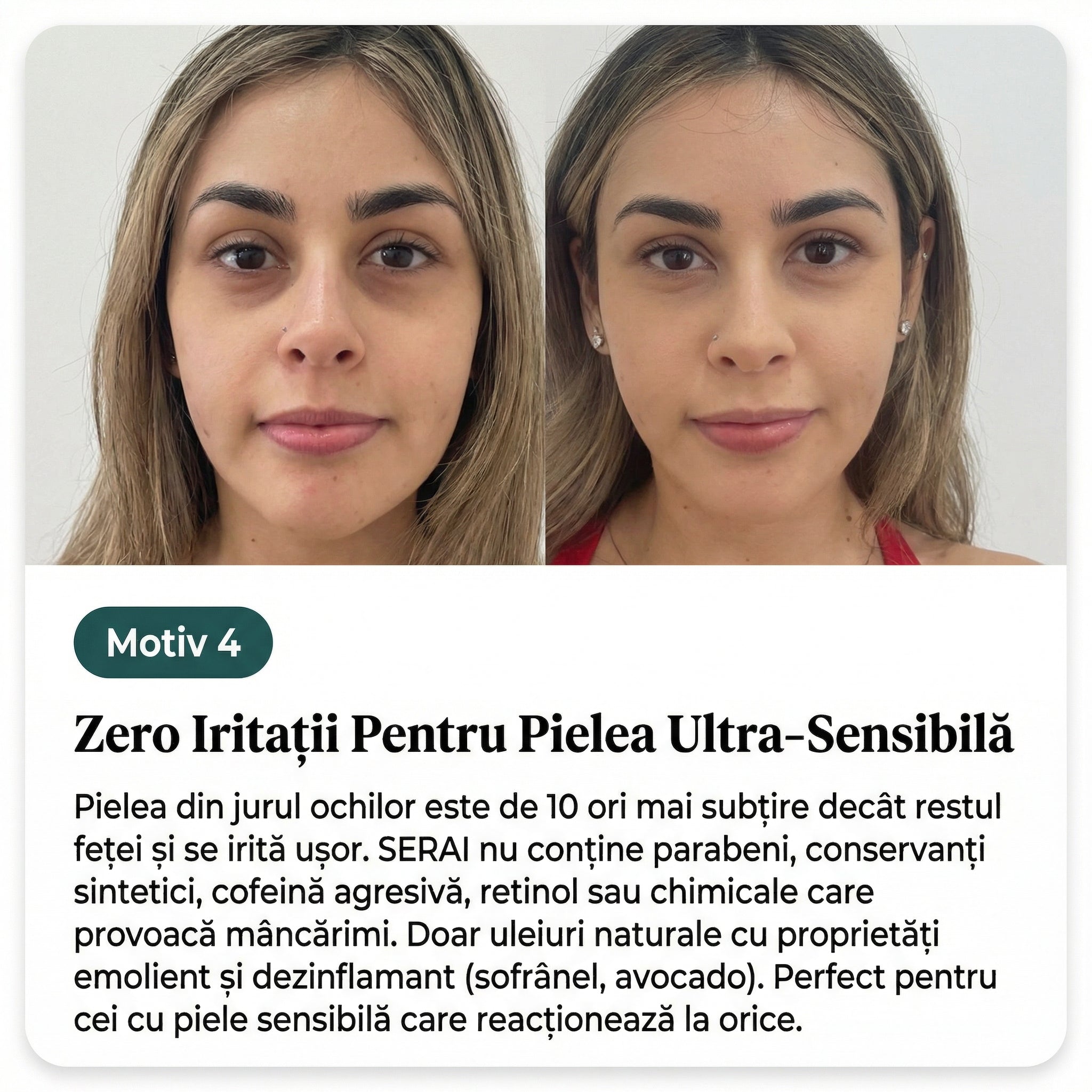 Da! SERAI este ideal pentru pielea sensibilă și reactivă din zona ochilor. Spre deosebire de cremele pentru ochi cu retinol sintetic, cofeină agresivă sau conservanți care irită și provoacă roșeață, SERAI folosește doar ingrediente naturale (uleiuri de avocado, macadamia, migdale dulci, semințe de struguri, sofrânel) care calmează, hrănesc și regenerează fără să agreseze. Formula este testată dermatologic și nu conține substanțe iritante, parabeni sau conservanți sintetici. Pielea din jurul ochilor este de 10 ori mai subțire și mai sensibilă decât restul feței - de aceea SERAI e formulat special pentru această zonă delicată. Dacă ai pielea foarte sensibilă, testează mai întâi pe o mică zonă a încheieturii mâinii înainte de aplicarea completă pe față.