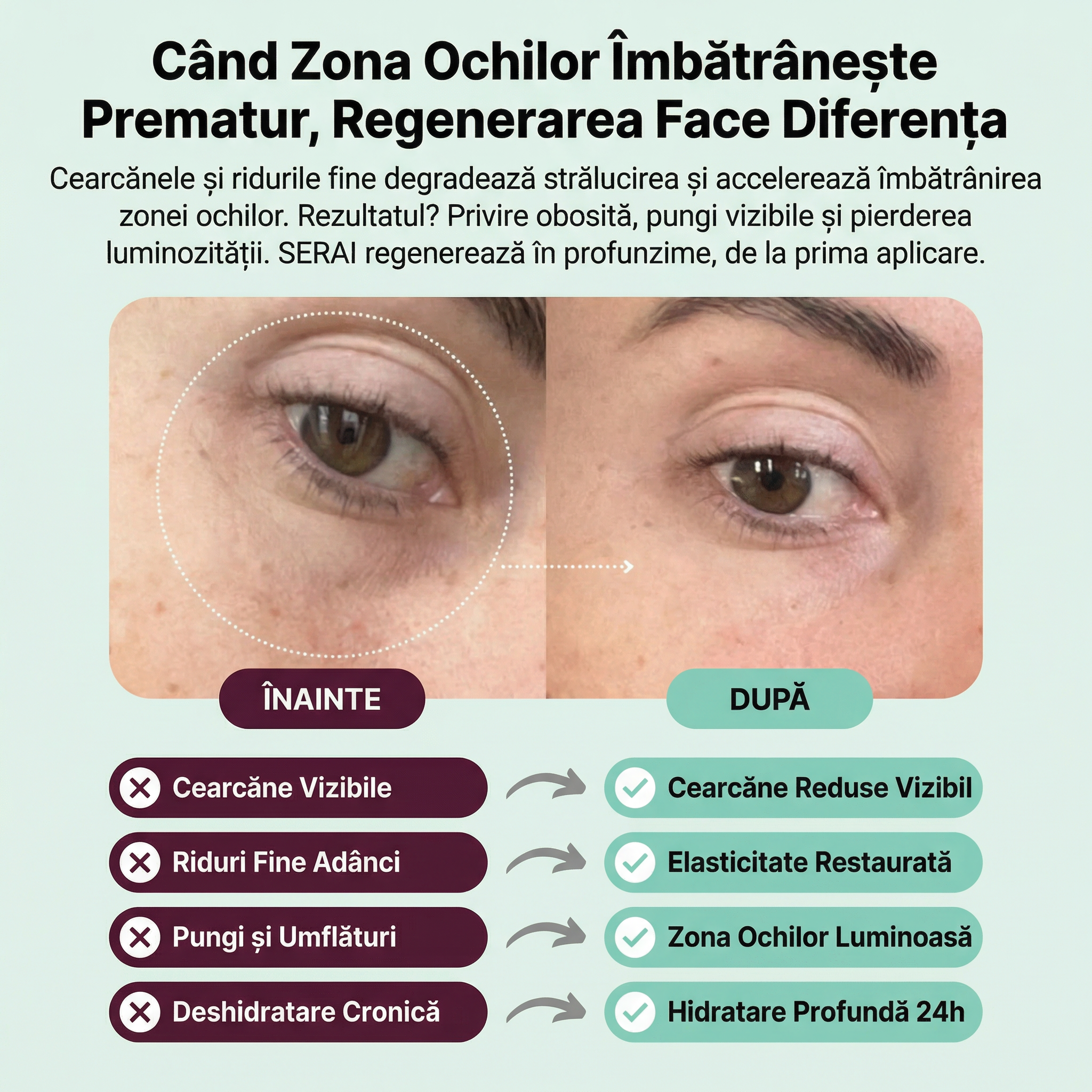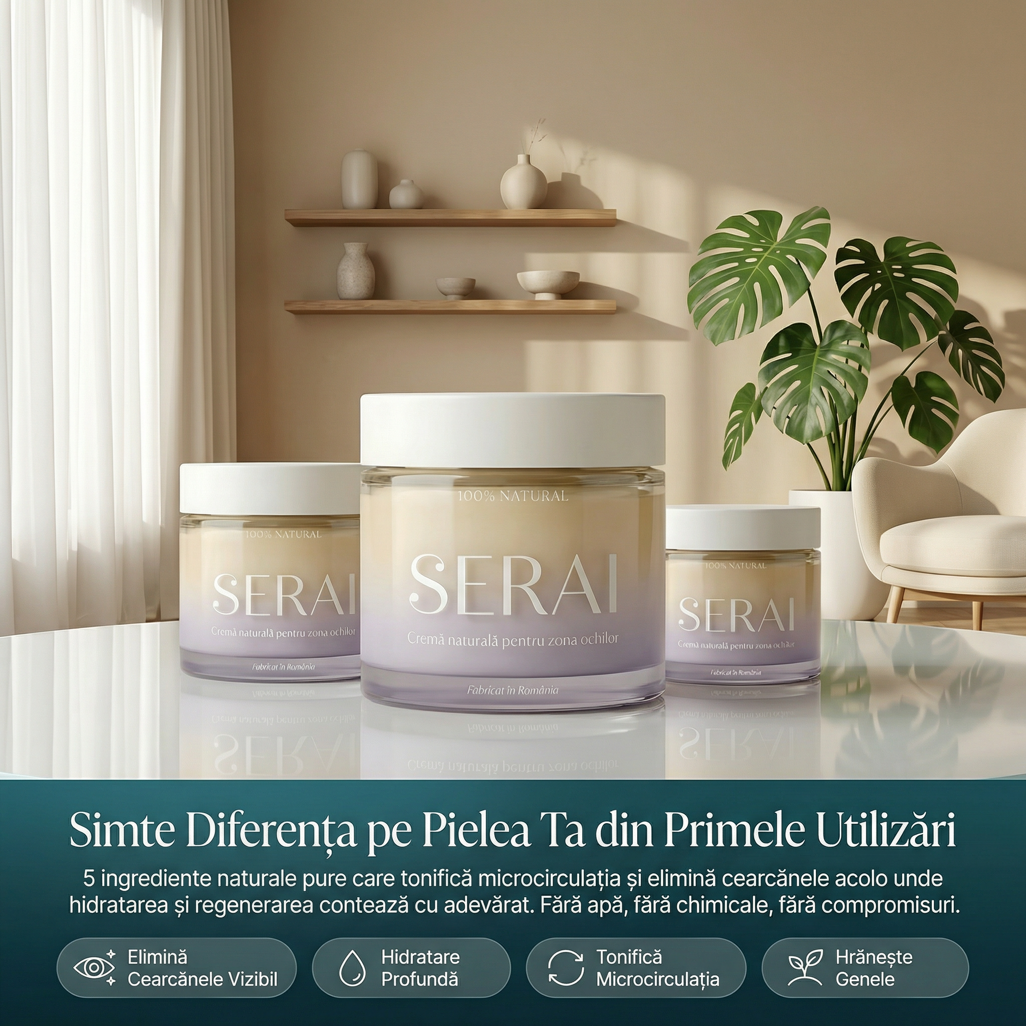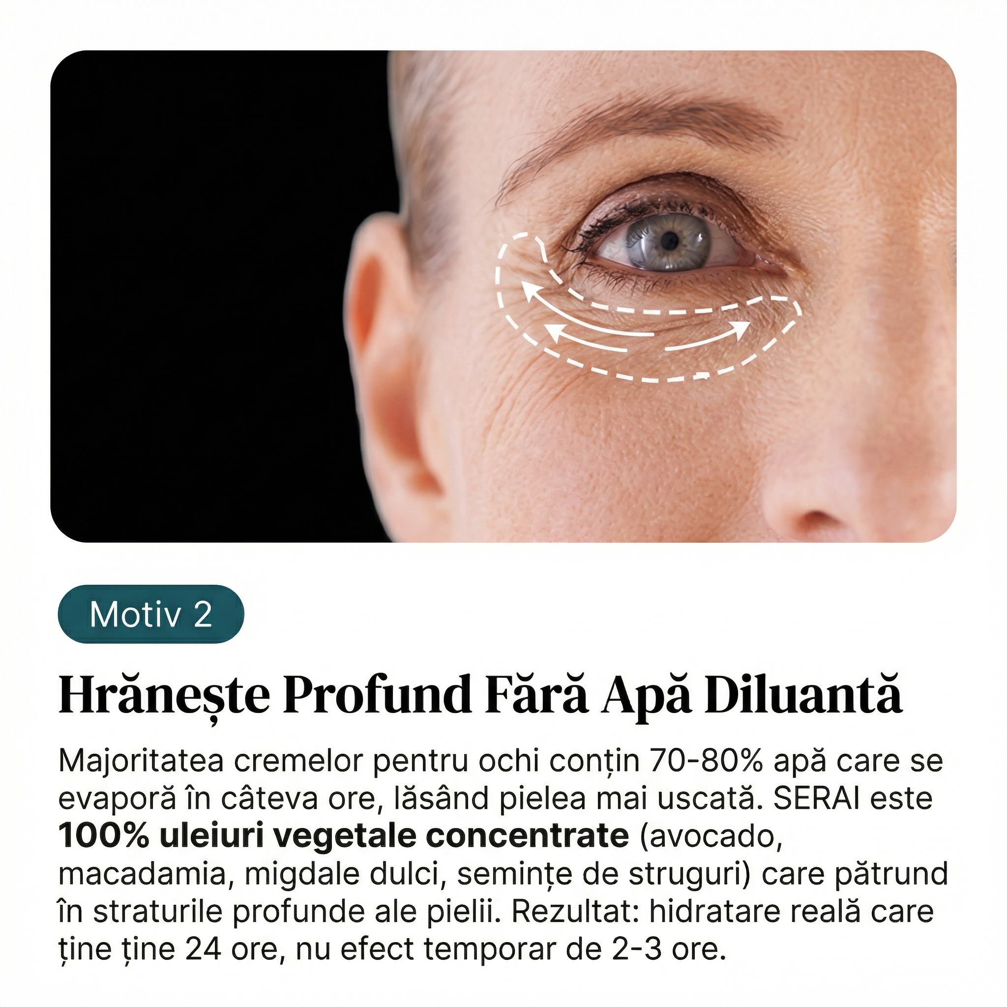 Pielea din jurul ochilor este de 10 ori mai subțire decât restul feței. Are nevoie de îngrijire specializată, nu de o cremă universală diluată. SERAI este formulată specific pentru această zonă sensibilă - fără ingrediente agresive, doar nutriție pură concentrată.