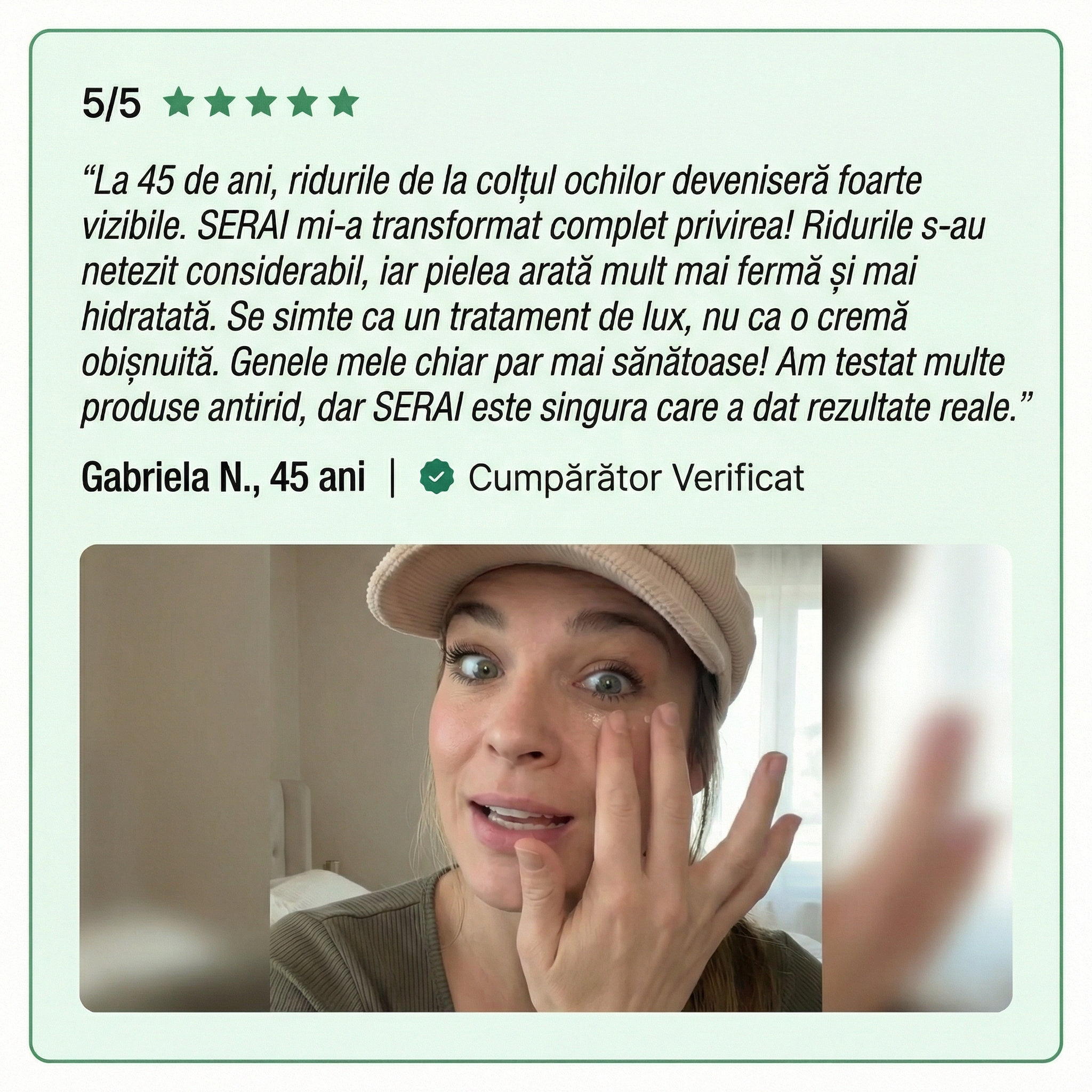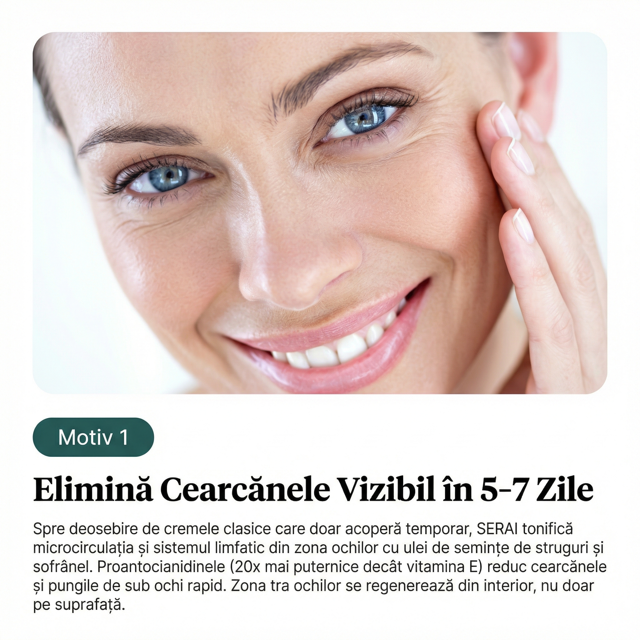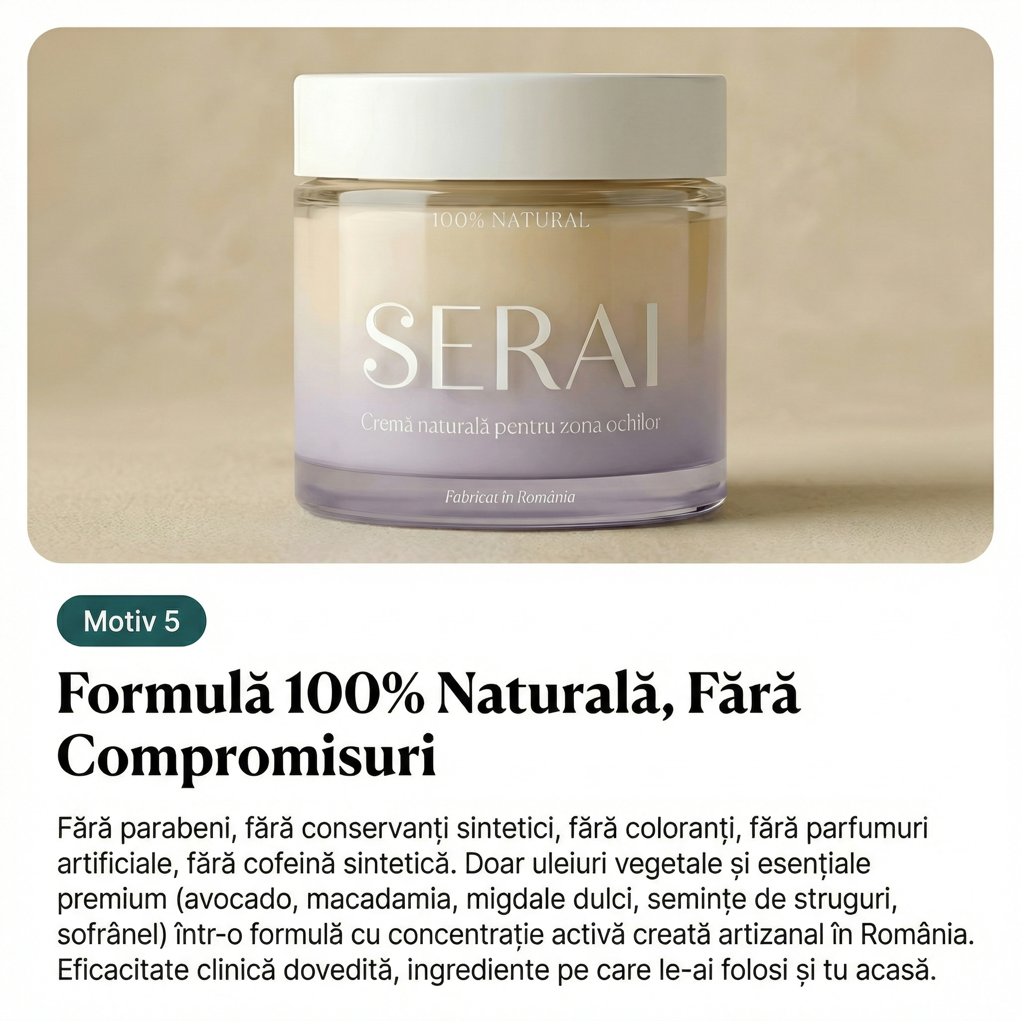 Pielea din jurul ochilor este de 10 ori mai subțire decât restul feței. Are nevoie de îngrijire specializată, nu de o cremă universală diluată. SERAI este formulată specific pentru această zonă sensibilă - fără ingrediente agresive, doar nutriție pură concentrată.
