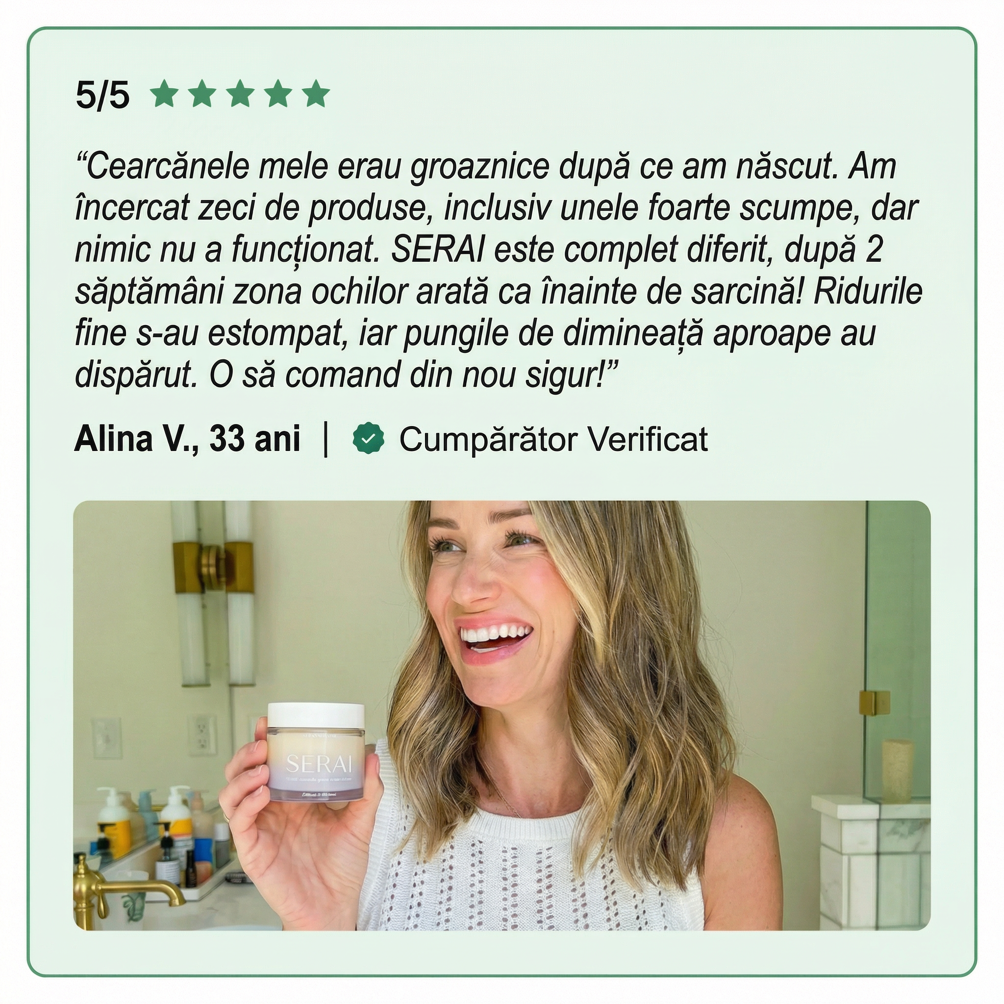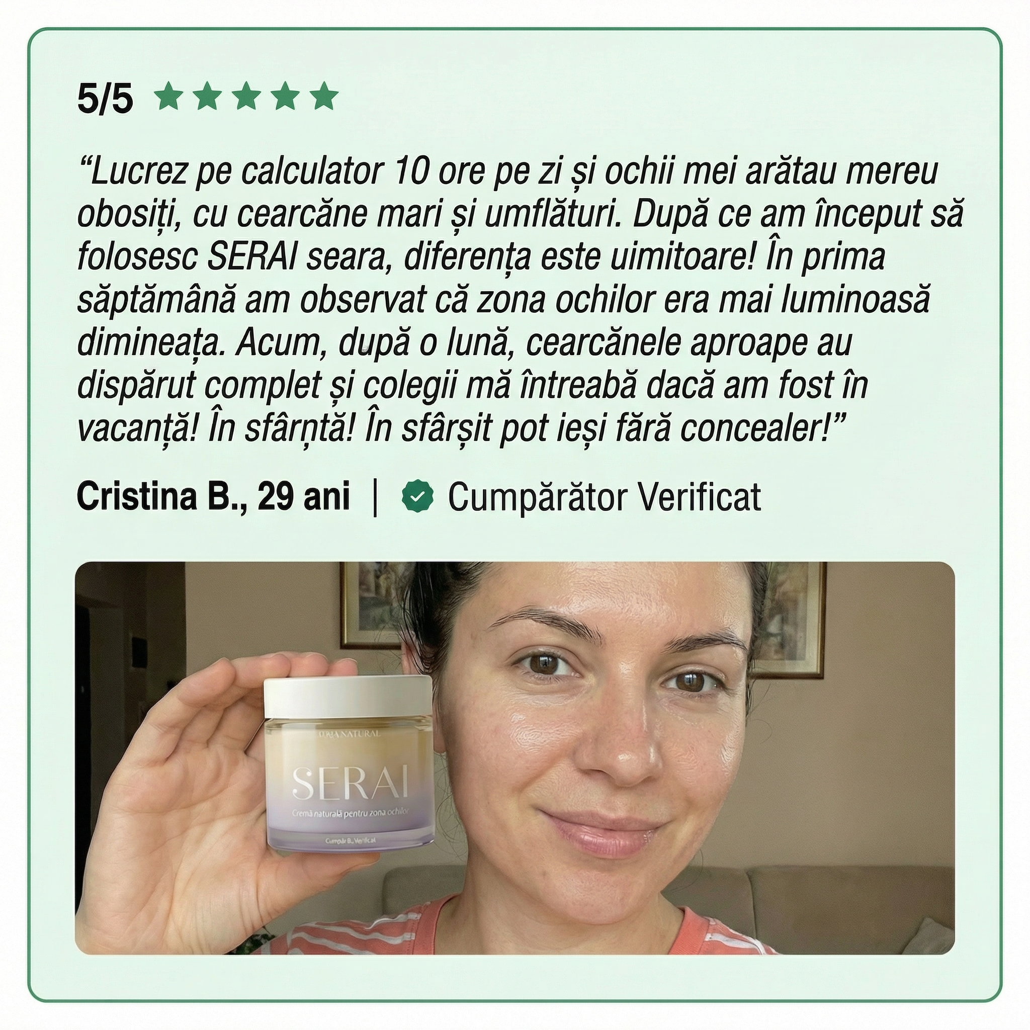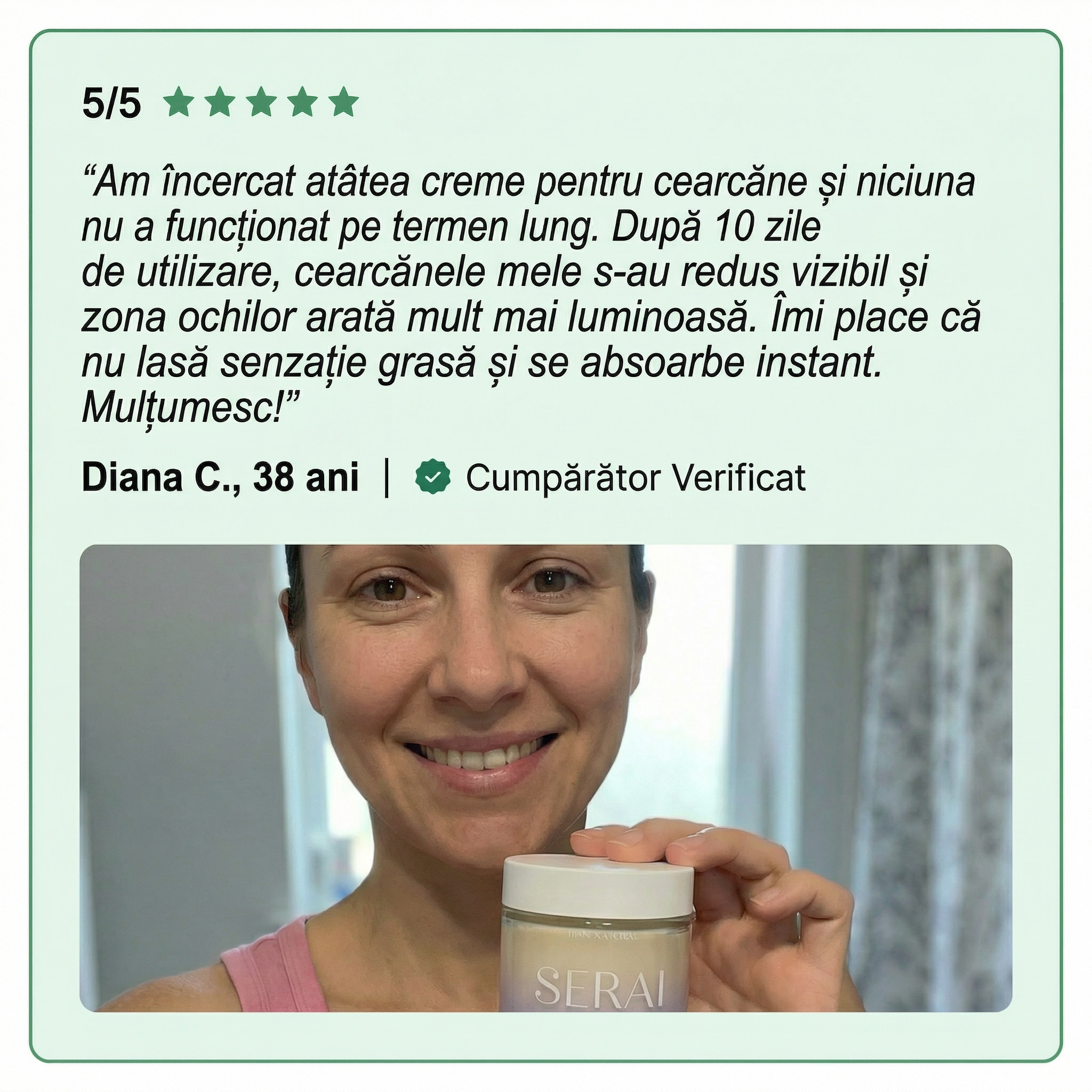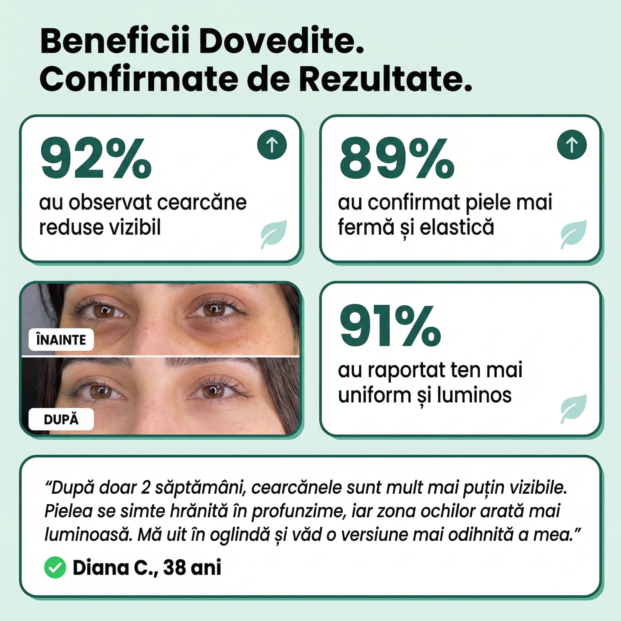 Când vei vedea rezultate: Primele îmbunătățiri în 5-7 zile (hidratare, zone mai luminoase). Reducere vizibilă a cearcănelor și ridurilor fine în 2-3 săptămâni de utilizare regulată. Transformare completă în 30 zile.