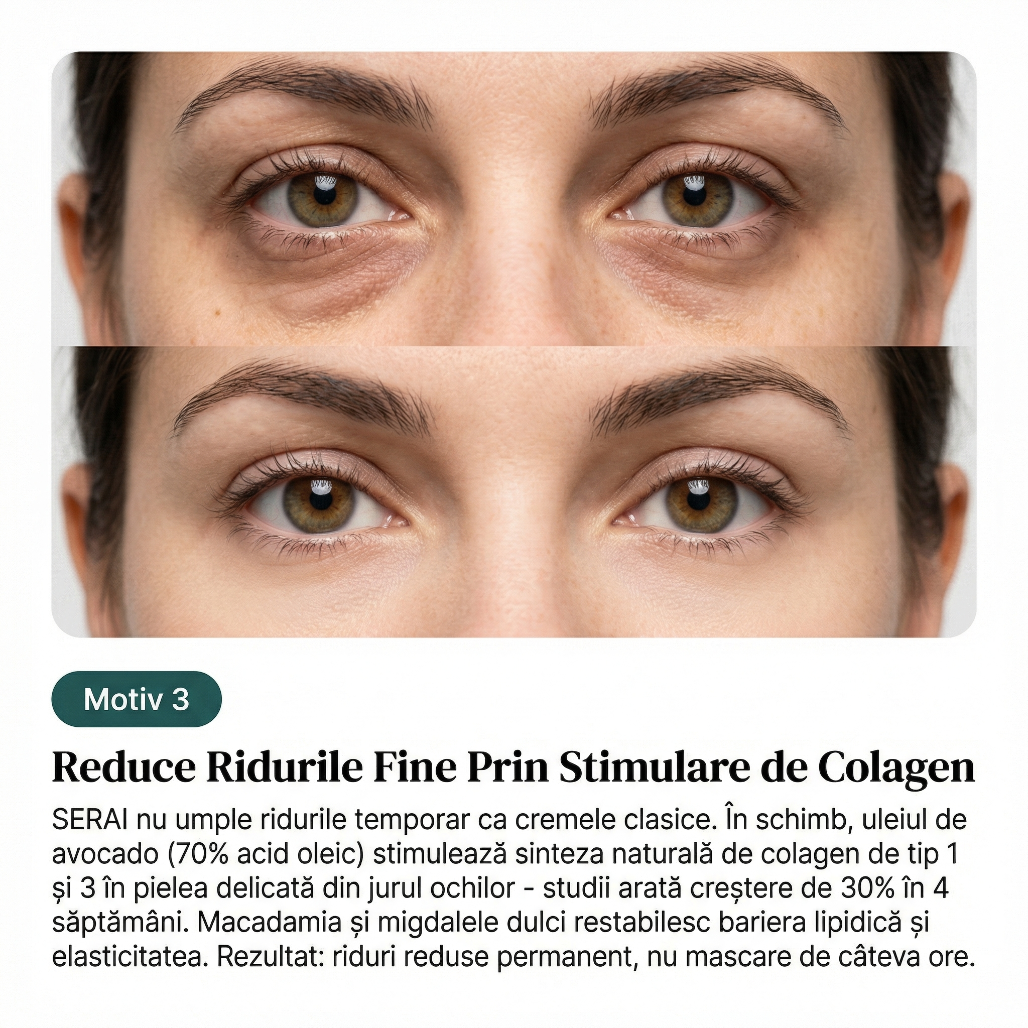 SERAI este o cremă naturală pentru zona ochilor care elimină cearcănele, reduce ridurile fine și regenerează pielea delicată în profunzime. Formula din 5 uleiuri premium (avocado, macadamia, migdale dulci, semințe de struguri, sofrânel) tonifică microcirculația, stimulează producția naturală de colagen și restabilește elasticitatea pielii. 100% uleiuri active (fără apă diluantă) hrănesc derma profund, blochează enzimele care descompun colagenul și asigură hidratare de lungă durată. Rezultat: cearcăne reduse vizibil, riduri estompate, zona ochilor luminoasă, genele hrănite și aspect vizibil mai tânăr în 5-7 zile.