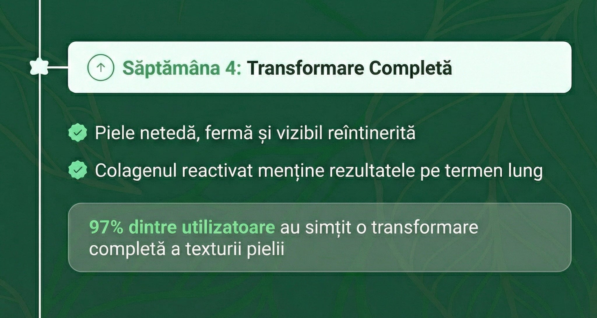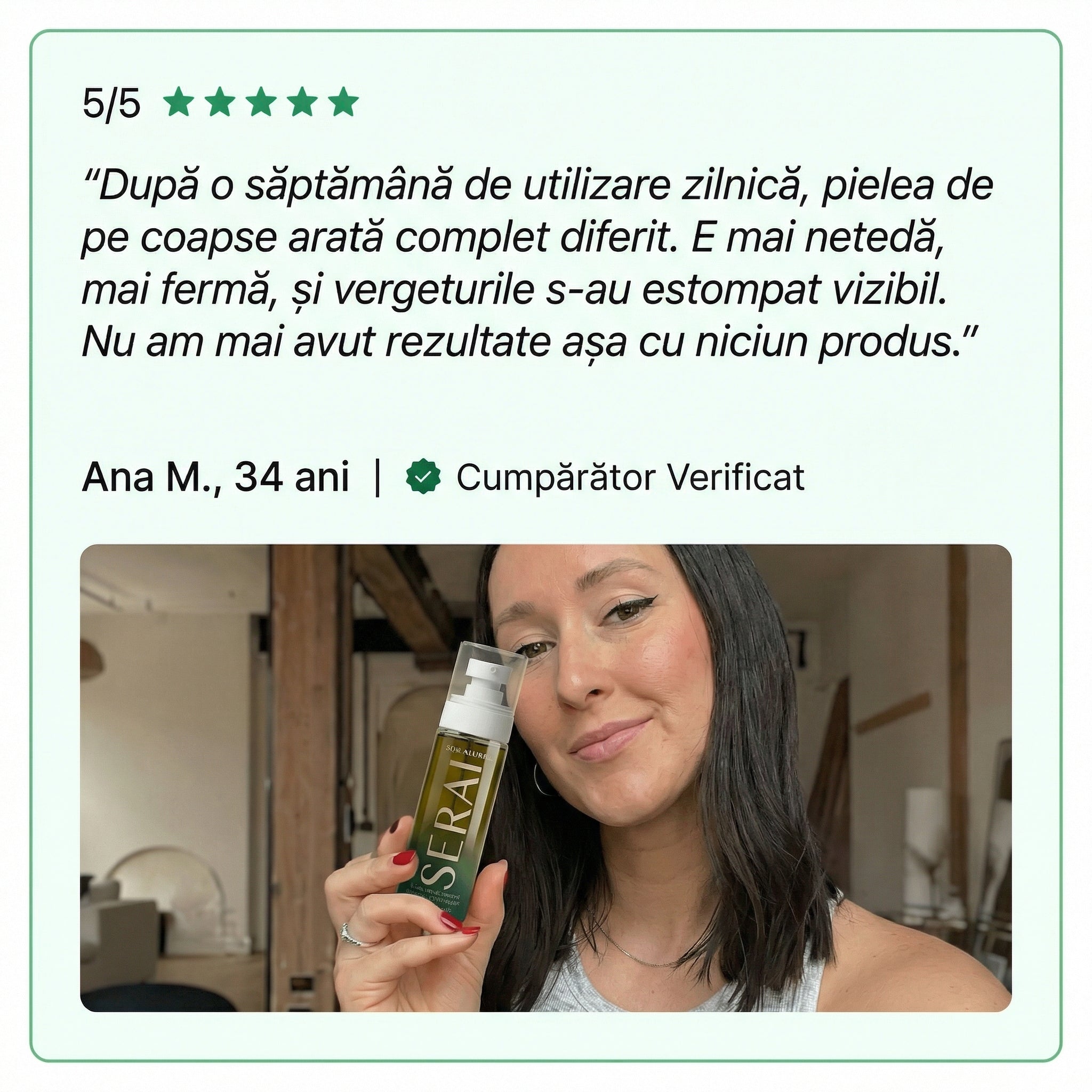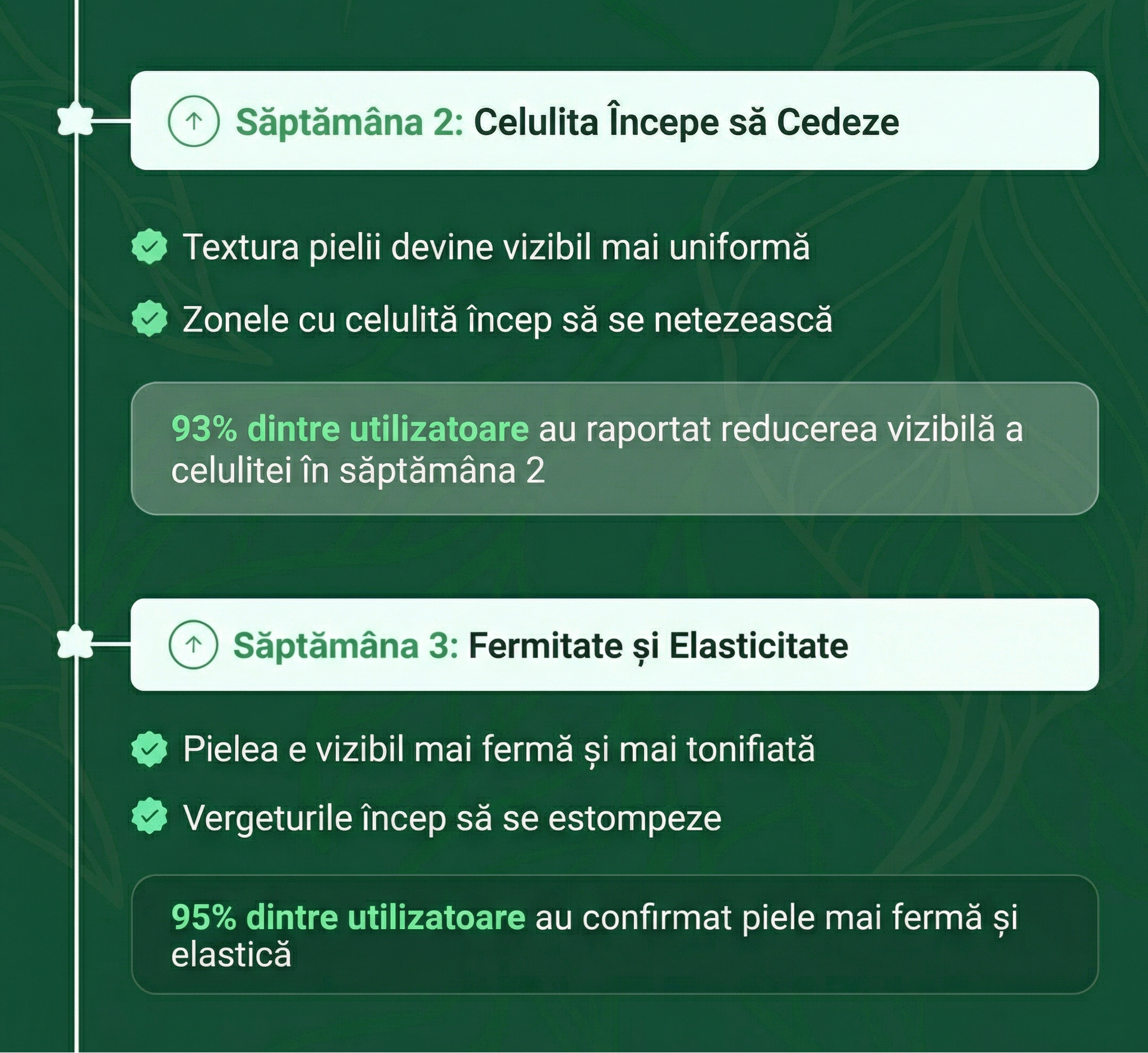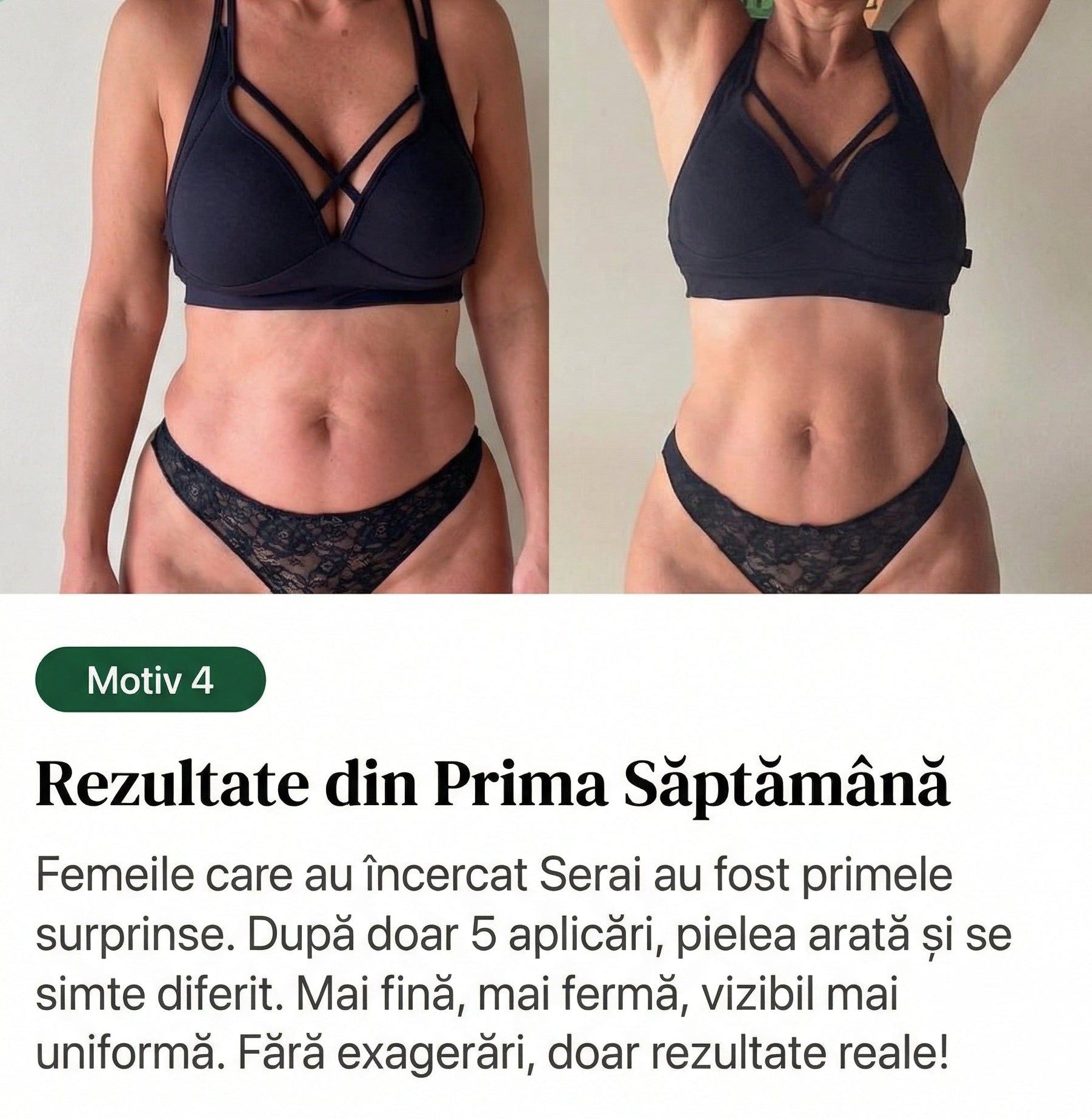 Majoritatea femeilor observă o diferență vizibilă în textura pielii după doar 5 aplicări. Pielea se simte mai catifelată și mai hidratată încă de la prima utilizare, iar rezultatele se îmbunătățesc cu fiecare aplicare.