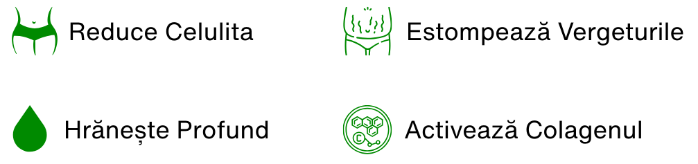 Uleiurile esențiale de salvie și grefă stimulează circulația și descompun depozitele de grăsime. Uleiurile de avocado și macadamia reconstruiesc colagenul și redau elasticitatea.