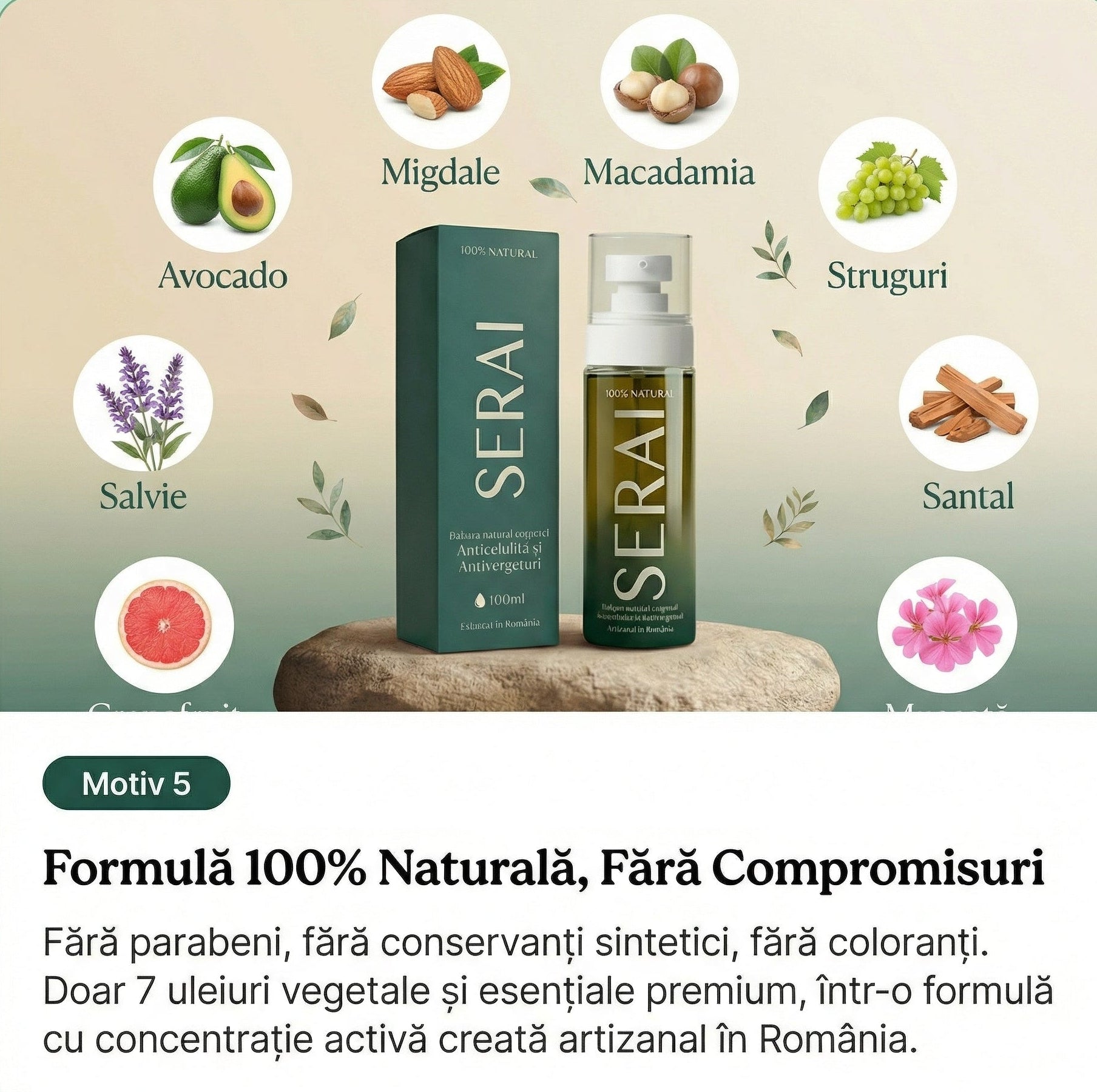 7 uleiuri premium - avocado, migdal, macadamia, struguri, salvie, santal și grefă care penetrează profund, stimulează colagenul și activează microcirculația. Piele mai fermă, mai netedă, mai tânără. 100% Natural. Fabricat în România 🇷🇴