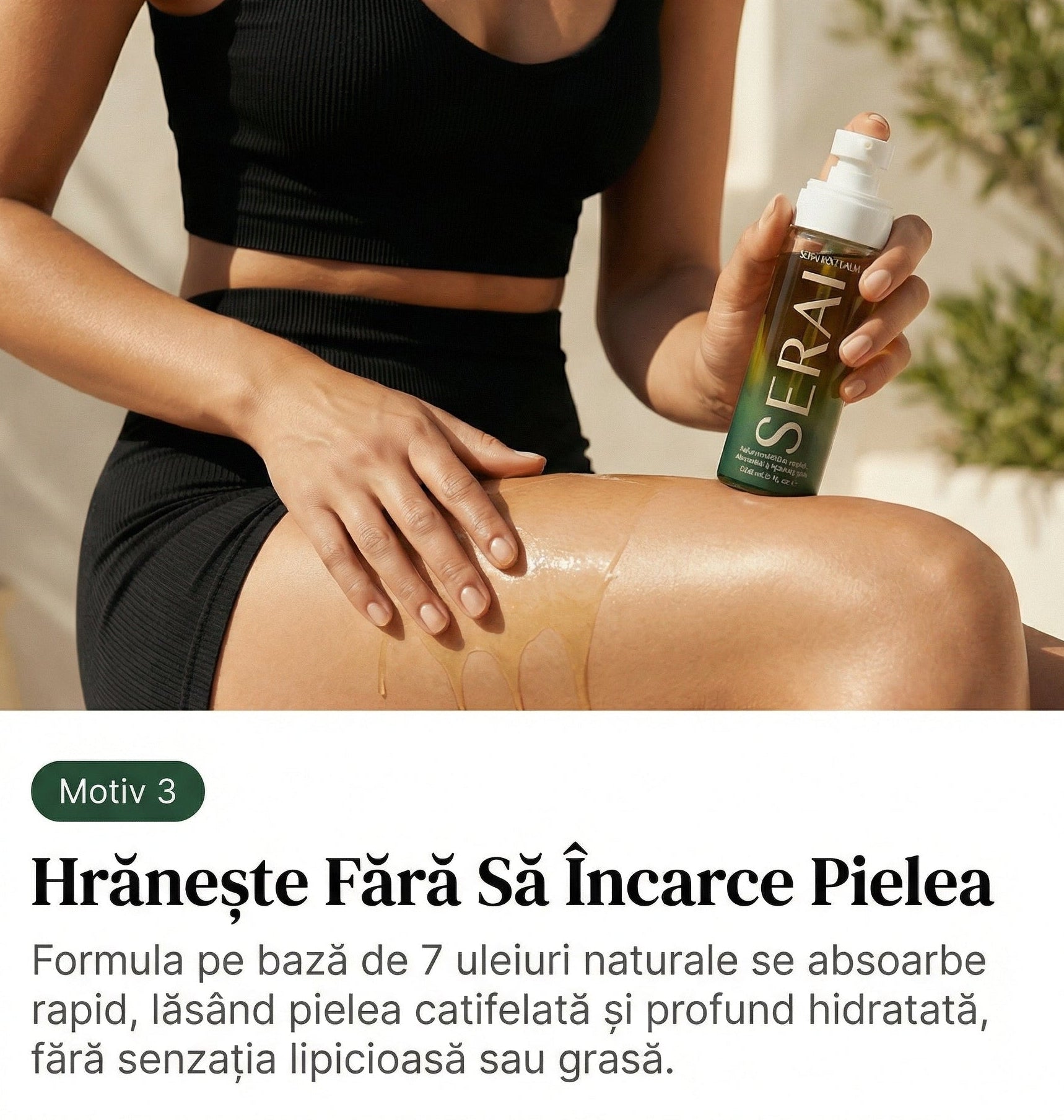 Serai este un balsam natural corporal care combate celulita și vergeturile. Formula din 7 uleiuri premium stimulează circulația, activează drenajul limfatic și hrănește pielea în profunzime, lăsând-o mai fermă, mai netedă și vizibil mai uniformă.