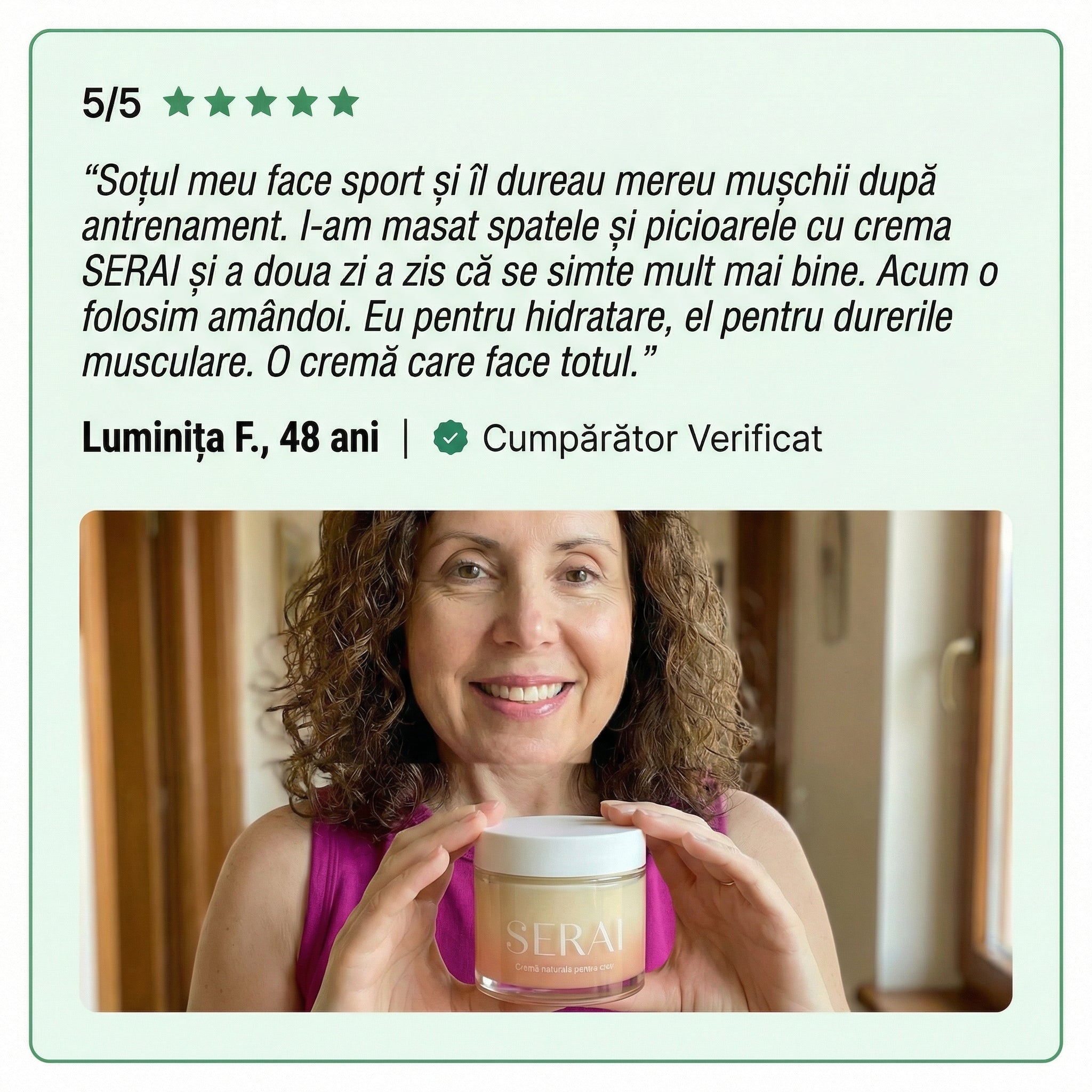 Absolut da! SERAI este formulat special pentru utilizare zilnică, ori de câte ori simți nevoia. Formula 100% naturală, fără parabeni, conservanți sintetici sau coloranți, este blândă cu pielea și potrivită pentru uz constant pe termen lung. De fapt, activarea circulației și nutriția profundă funcționează cel mai bine când o folosești zilnic, nu doar ocazional — pielea are nevoie de îngrijire consistentă pentru a menține hidratarea, elasticitatea și pentru a ameliora durerile musculare în mod continuu.