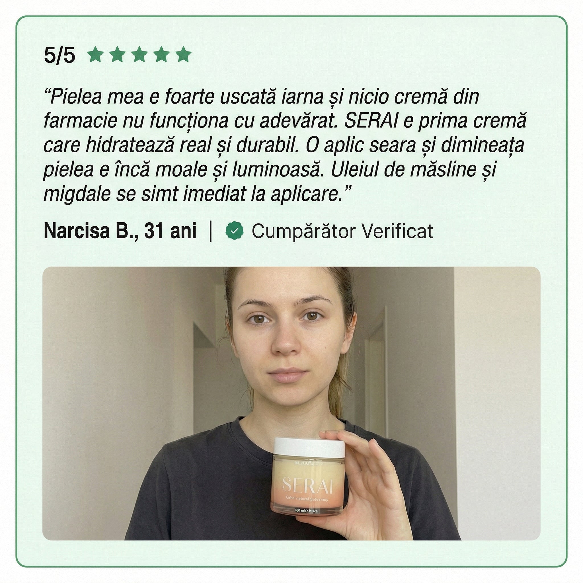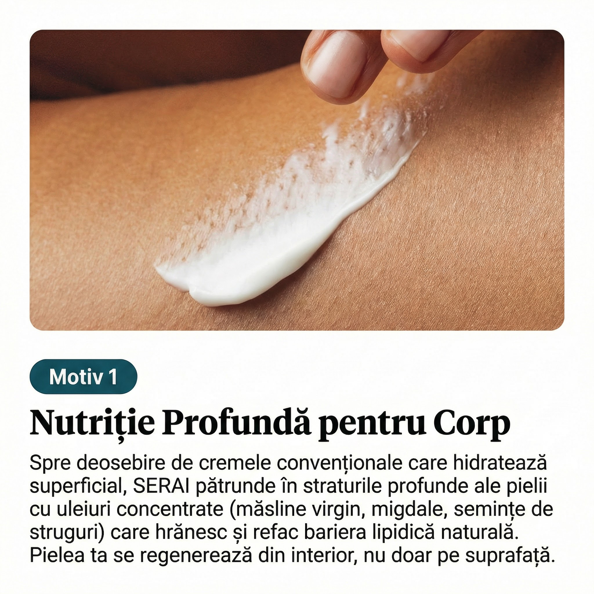 Da! SERAI este ideal pentru pielea sensibilă și reactivă. Spre deosebire de cremele pentru corp cu ingrediente sintetice care irită și provoacă roșeață, SERAI folosește doar ingrediente naturale (uleiuri de măsline, migdale, semințe de struguri, curcuma și ghimbir) care calmează și hrănesc fără să agreseze. Formula este testată dermatologic și nu conține substanțe iritante, parabeni sau conservanți sintetici. Dacă ai pielea foarte sensibilă, testează mai întâi pe o mică zonă a încheieturii mâinii înainte de aplicarea completă pe corp.