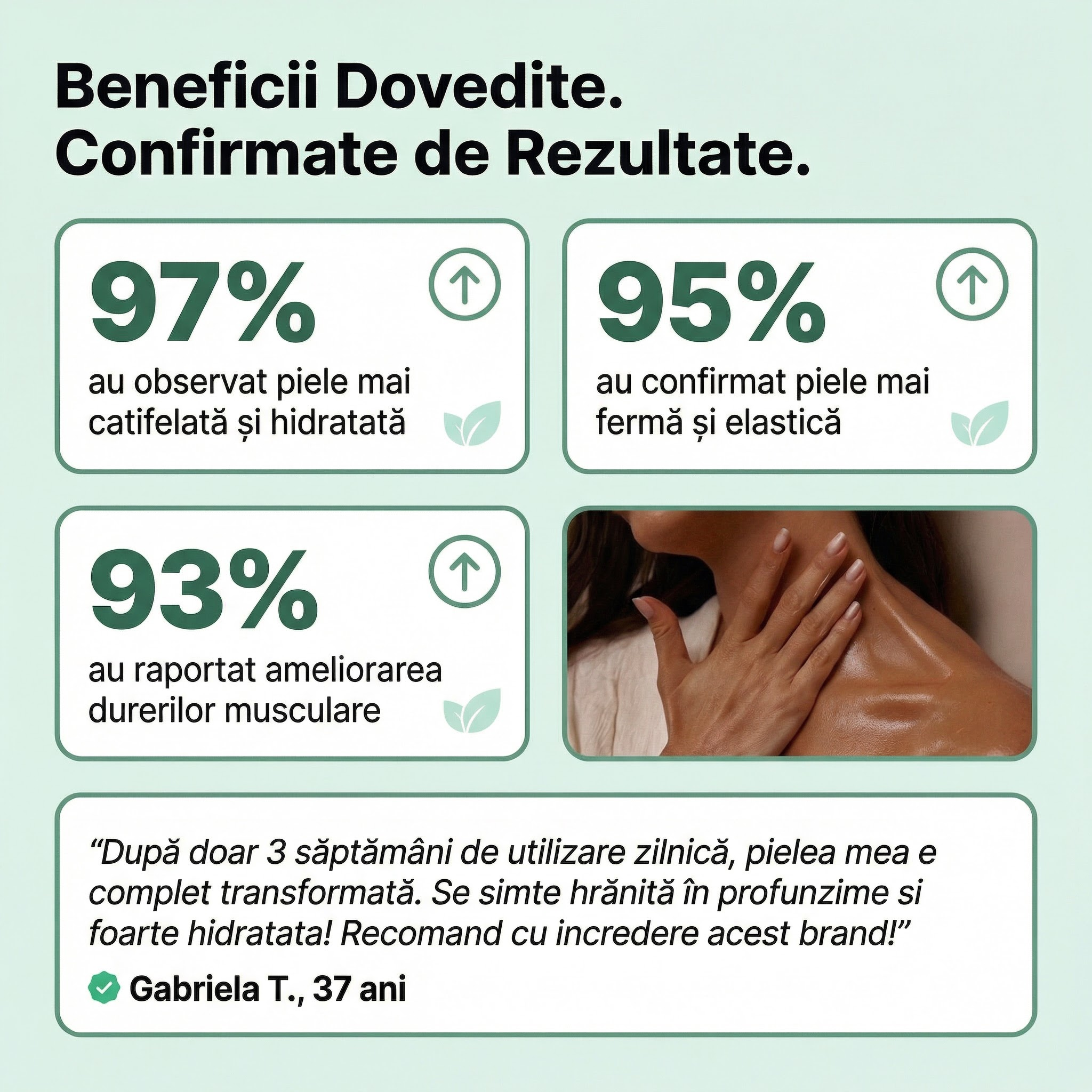 97% dintre utilizatoare observă piele mai hidratată și mai catifelată din primele 5 aplicări. 93% raportează piele vizibil mai elastică și mai luminoasă după 3 săptămâni de utilizare zilnică. Nutriția profundă devine vizibilă treptat: în prima săptămână pielea devine mai moale și mai catifelată, circulația se activează și durerile musculare se ameliorează, iar beneficiile complete apar cu fiecare aplicare zilnică consecventă.