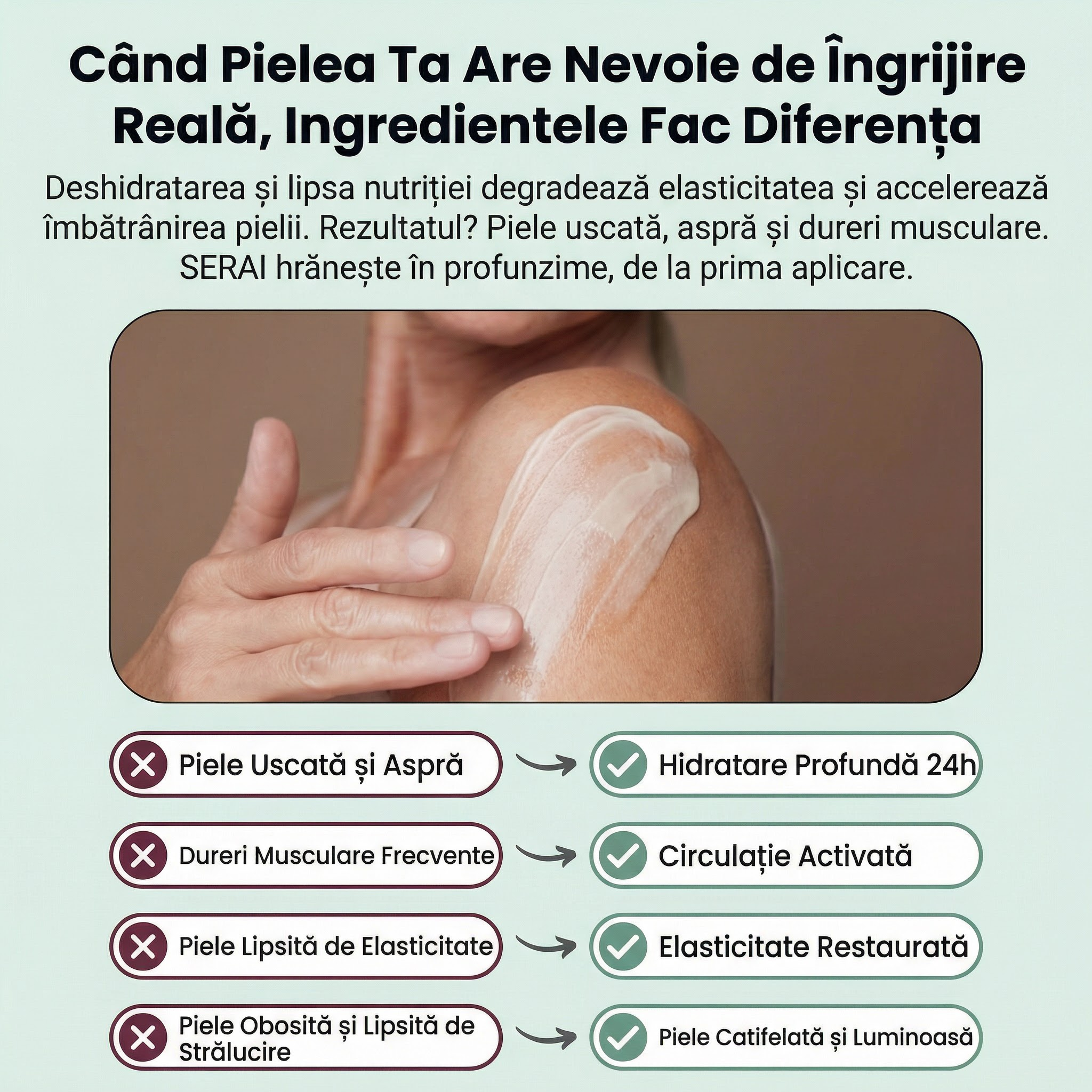 Când pielea corpului pierde elasticitate și hidratare, devine uscată, aspră și obosită. Durerile musculare și articulare se accentuează, iar circulația slabă agravează totul. Crema Naturală pentru Corp SERAI hrănește pielea cu ingrediente 100% naturale, activează circulația și ameliorează durerile musculare, oferind o piele vizibil mai catifelată, mai elastică și mai luminoasă.