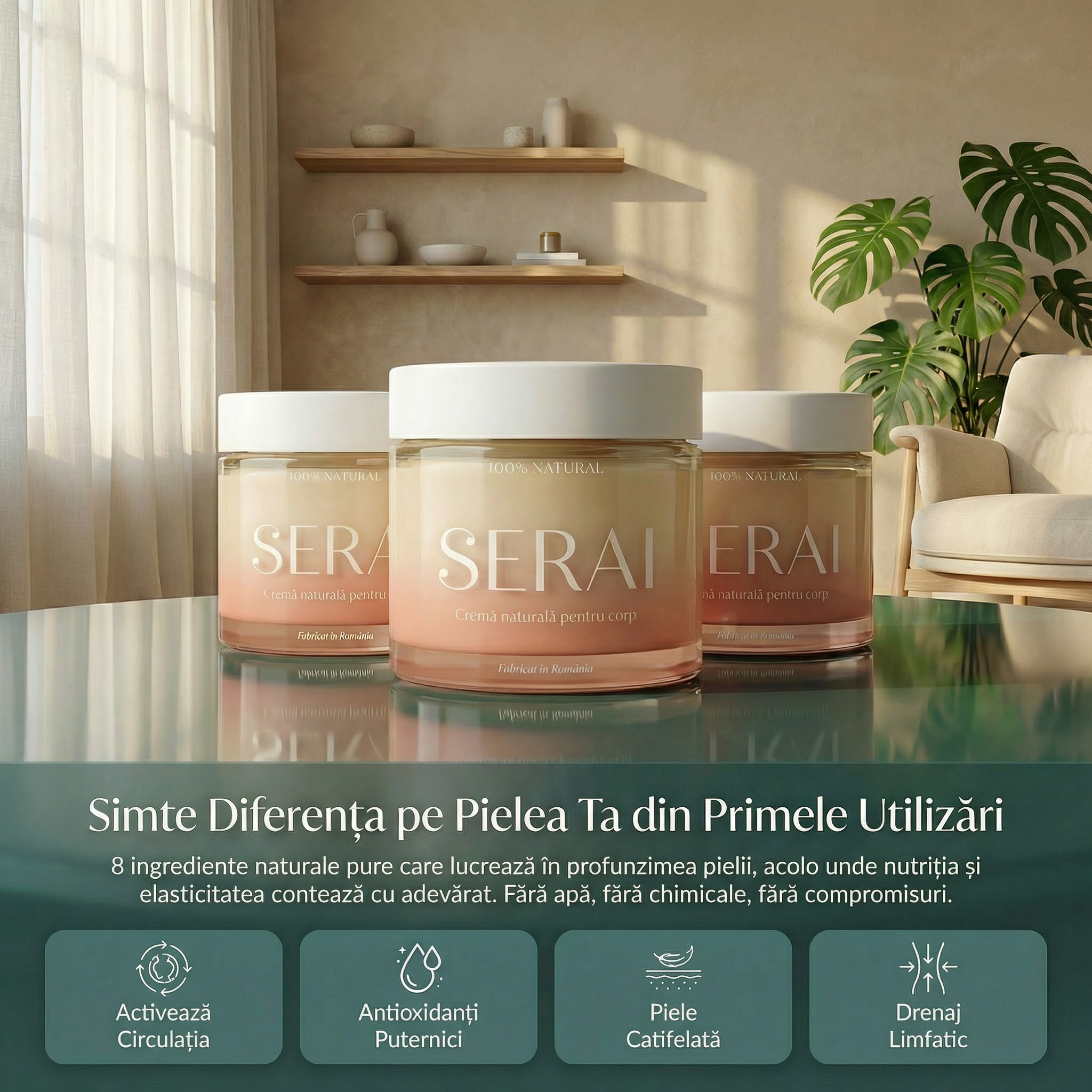 SERAI este o cremă naturală pentru corp care hrănește pielea în profunzime și activează circulația. Formula din 8 uleiuri premium (măsline virgin, migdale dulci, semințe de struguri, curcuma, ghimbir, nucșoară, piper negru și lime) activează microcirculația, ameliorează durerile musculare și articulare și restabilește elasticitatea pielii. 100% uleiuri active (fără apă diluantă) hrănesc derma profund, reduc inflamațiile și asigură hidratare de lungă durată. Rezultat: piele mai catifelată, circulație îmbunătățită, dureri musculare ameliorate și aspect vizibil mai luminos și mai ferm.